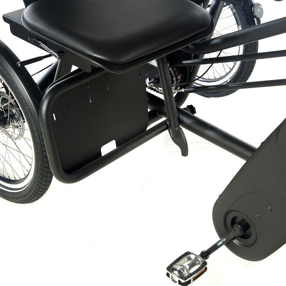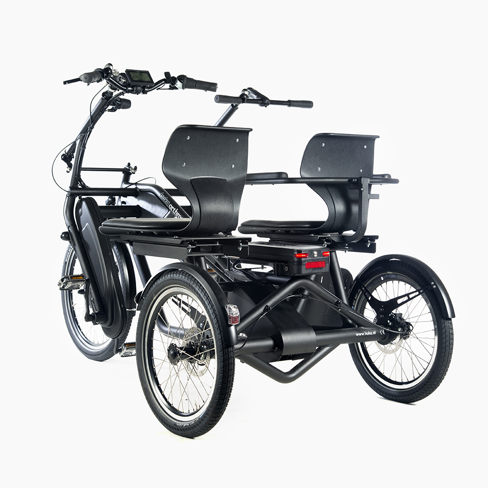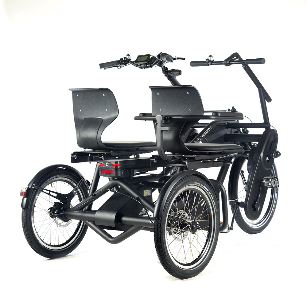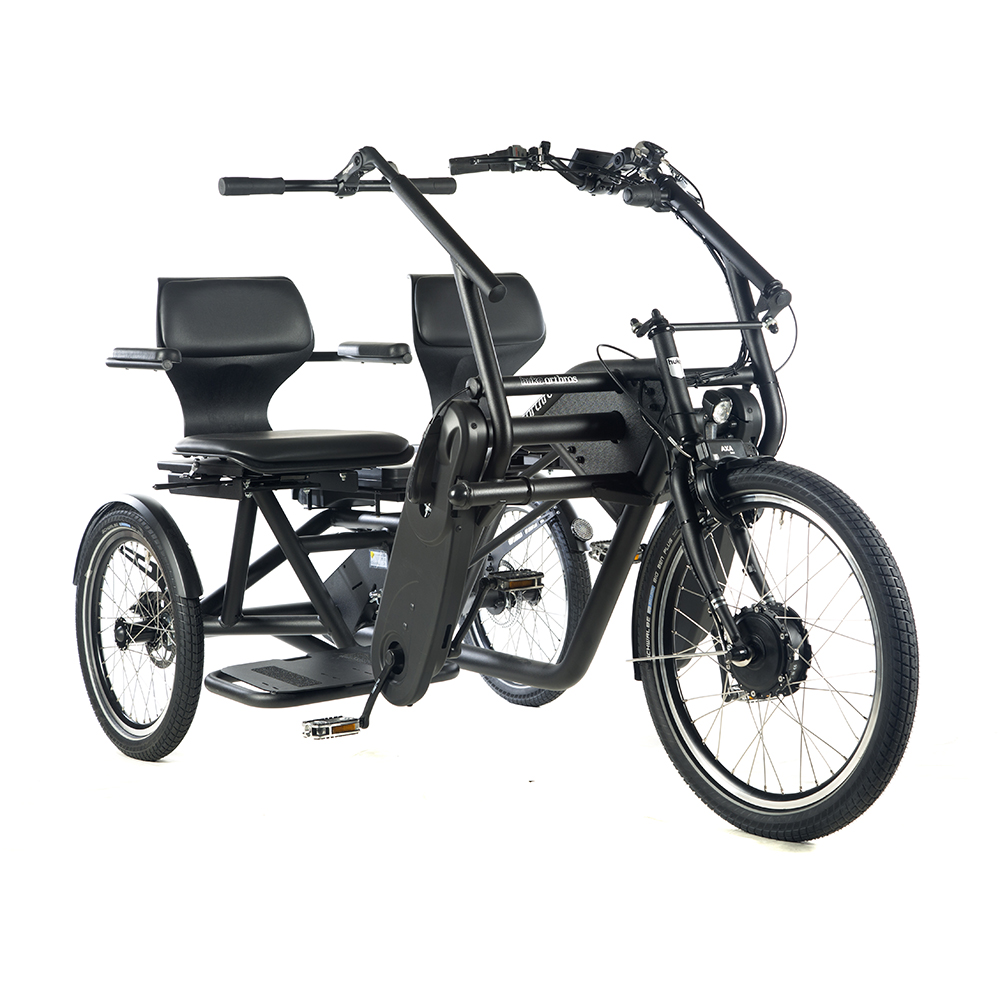 Beide opzittende kunnen mee-trappen en één persoon kan sturen. De zitting van de bijrijder is standaard voorzien van een draaibare zitting. Door de drie wielen is deze fiets uitermate stabiel, bij stilstaand en als er gefietst wordt. De bijrijder is voorzien van een vrijloop waardoor de bijrijder niet verplicht is tot mee trappen en zijn/haar voeten kan laten rusten op de pedalen. Door de 8 versnellingen kunt u overal comfortabel fietsen, ook als u het even alleen moet doen.